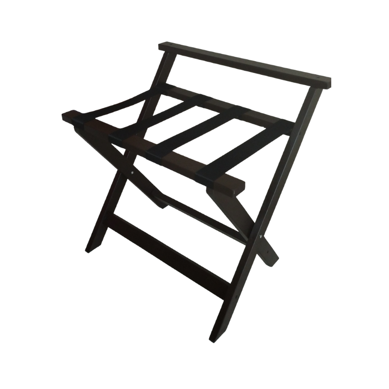 Apoyamaletas plegable de madera con respaldo y cintas de alta resistencia. Colores: Roble | Wengue | Negro | Blanco
